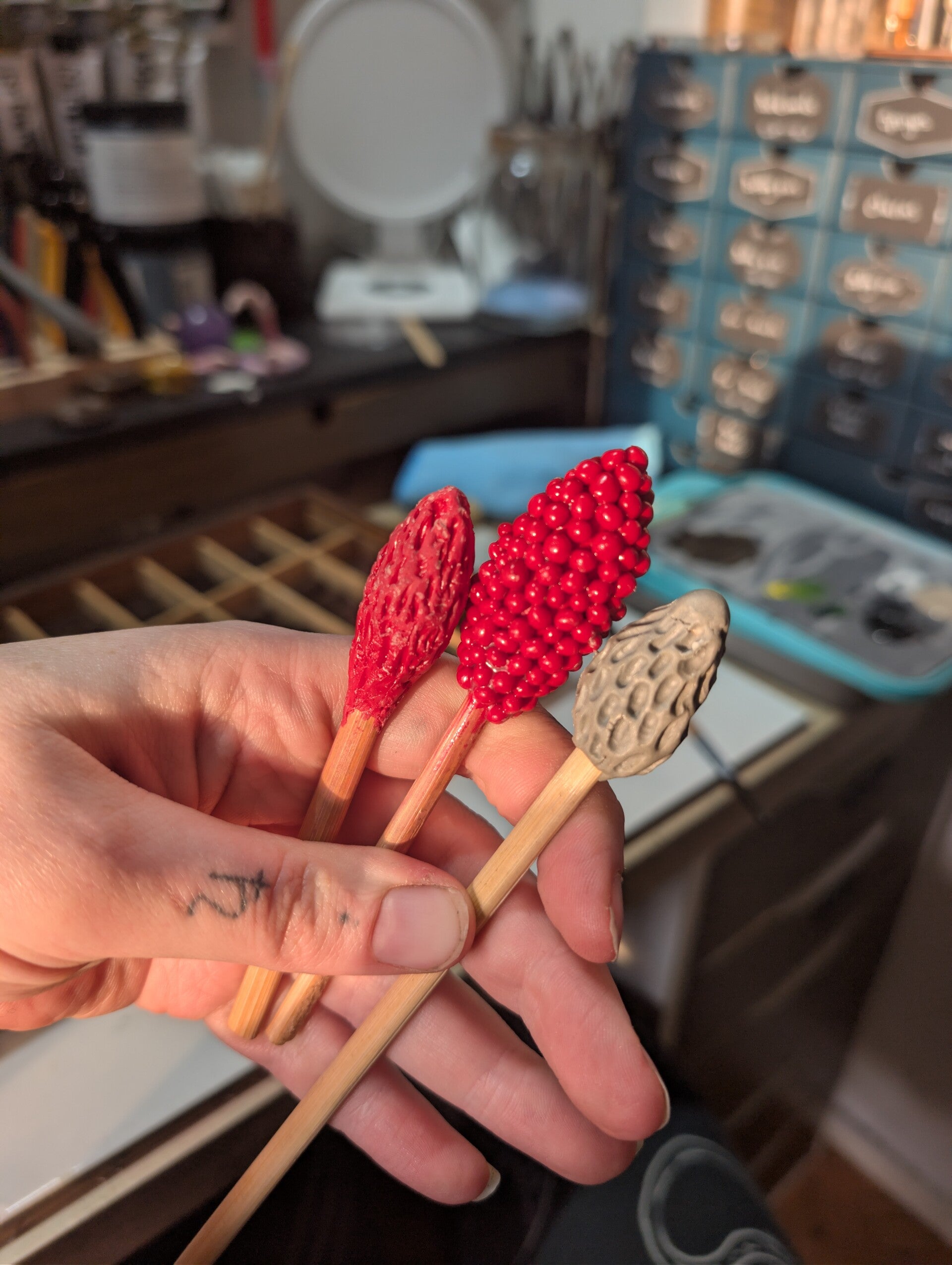 Got some clay in a colour you don't use, or have some leftovers? Make yourself a texturing tool! For these I once again used a chopstick as a handle, because they are plenty in our household. I added a base of clay to one end and created a dotted or striped texture. For the middle one I created many, many small balls and added them onto the base layer of clay. You can go as creative as you like with this, making rigid or more natural patterns, dabbing or rolling them on the clay.