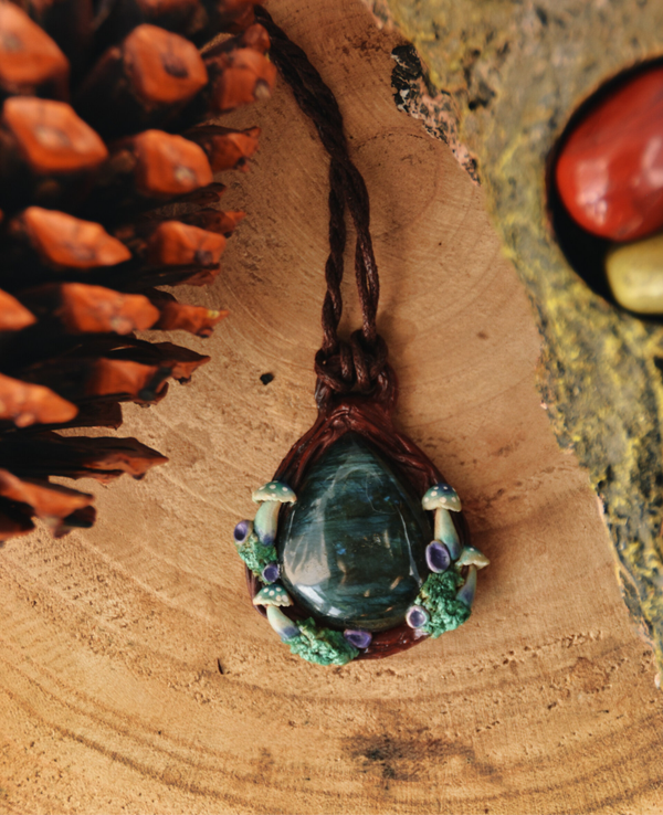 These one-of-a-kind whimsical mushroom pendants each feature a gorgeous genuine crystal. The mushrooms, branches and moss are carefully hand-sculpted, painted and varnished for durability. Each pendant comes with an adjustable cotton cord so it's wearable out of the box. Eager to add a touch of whimsy to your wardrobe, wait no longer!