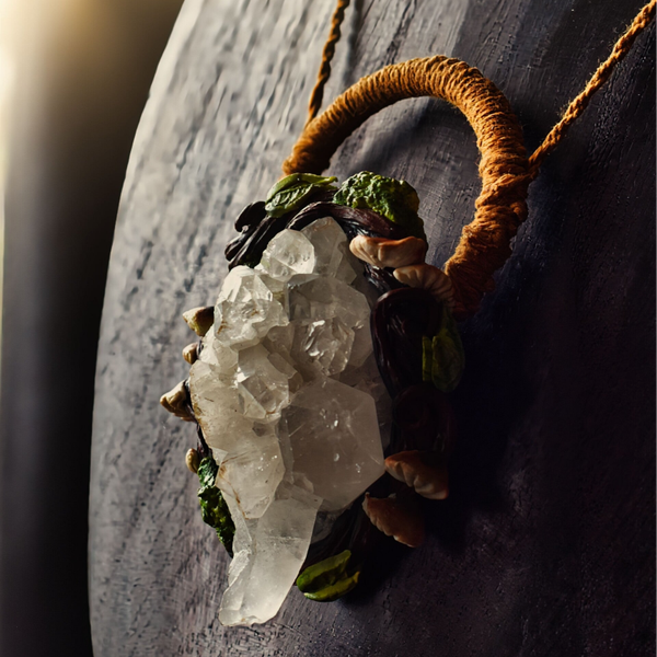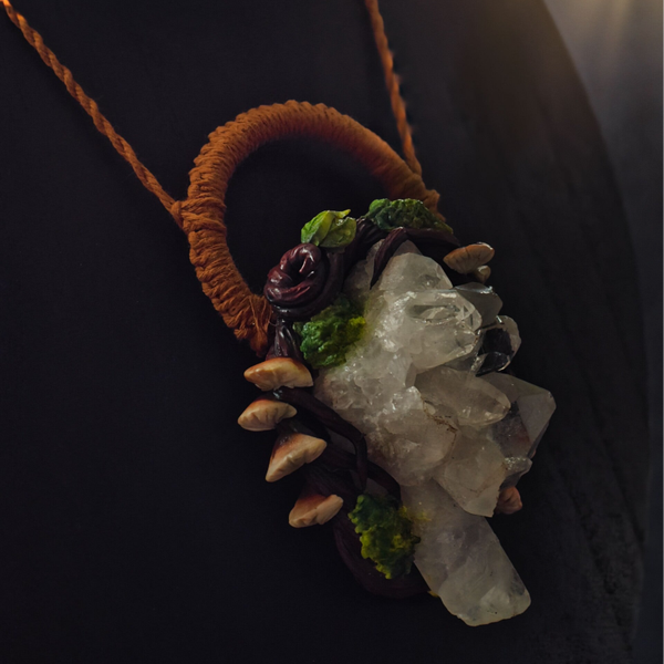 This gorgeous statement piece features a large quartz druzy as the centre. Surrounded by roots, mushrooms, leaf and moss details and a ring finished with macrame to bring the piece together.