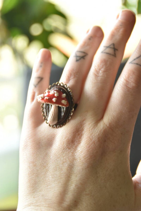 These gorgeous mushroom rings resemble tiny whimsical Amanita, both the Muscaria (Red) and Pantherina (Brown) are currently available. These are a cute foresty addition to your daily outfit or fantasy costume.