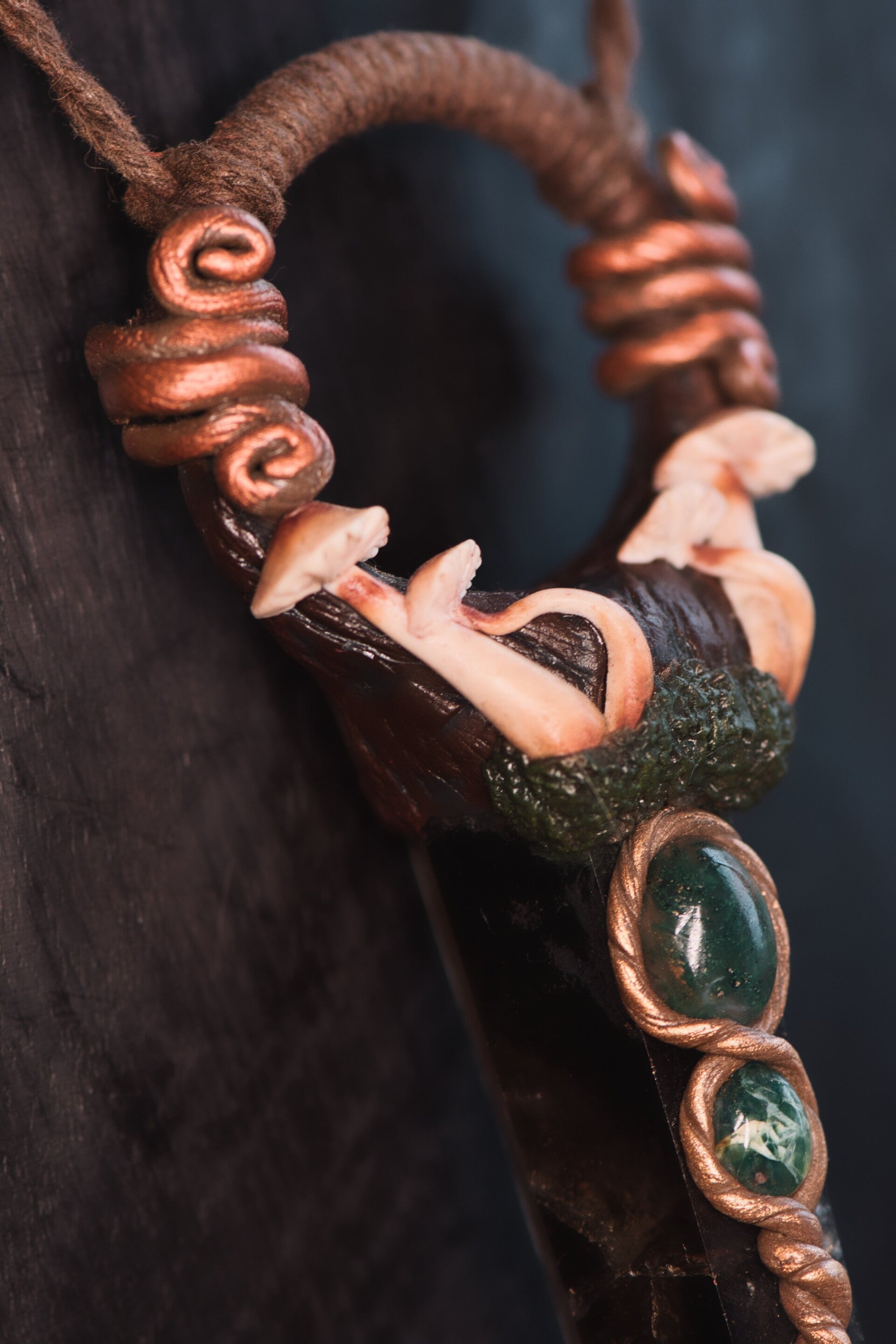 This gorgeous one-of-a-kind talisman has a big Smokey Quartz tower as its main feature. Decorated with two small Moss agate cabochons and plenty of hand-sculpted details, this is a statementpiece that would look gorgeous with fancy dress, a cosplay/costume or with any alternative wear.