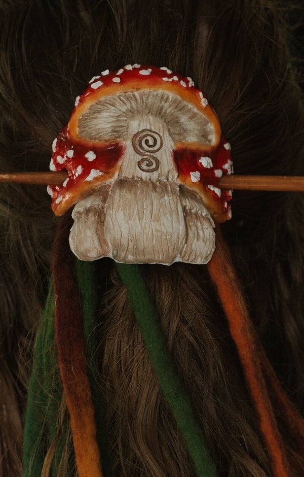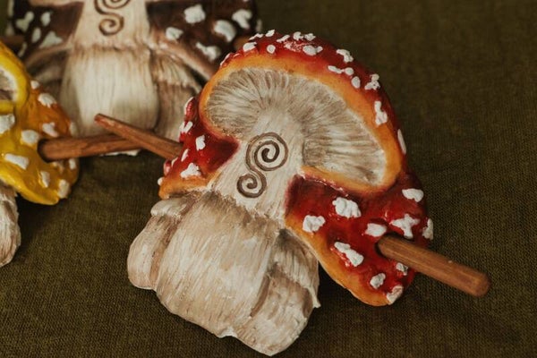 These Amanita hairpins are the perfect whimsical addition to your outfit! Fit for everyday wear, cosplay or renfair outfits, these mushroom-inspired pieces are made of durable cosclay and hand painted so each one is unique.