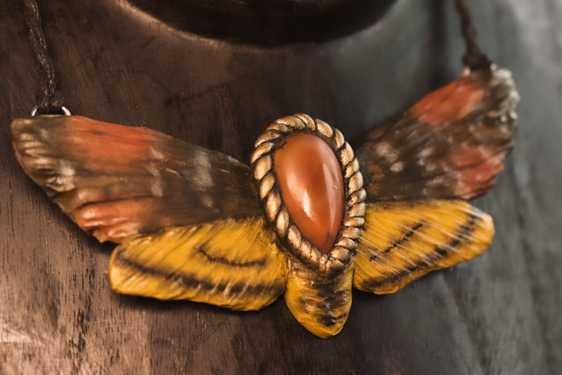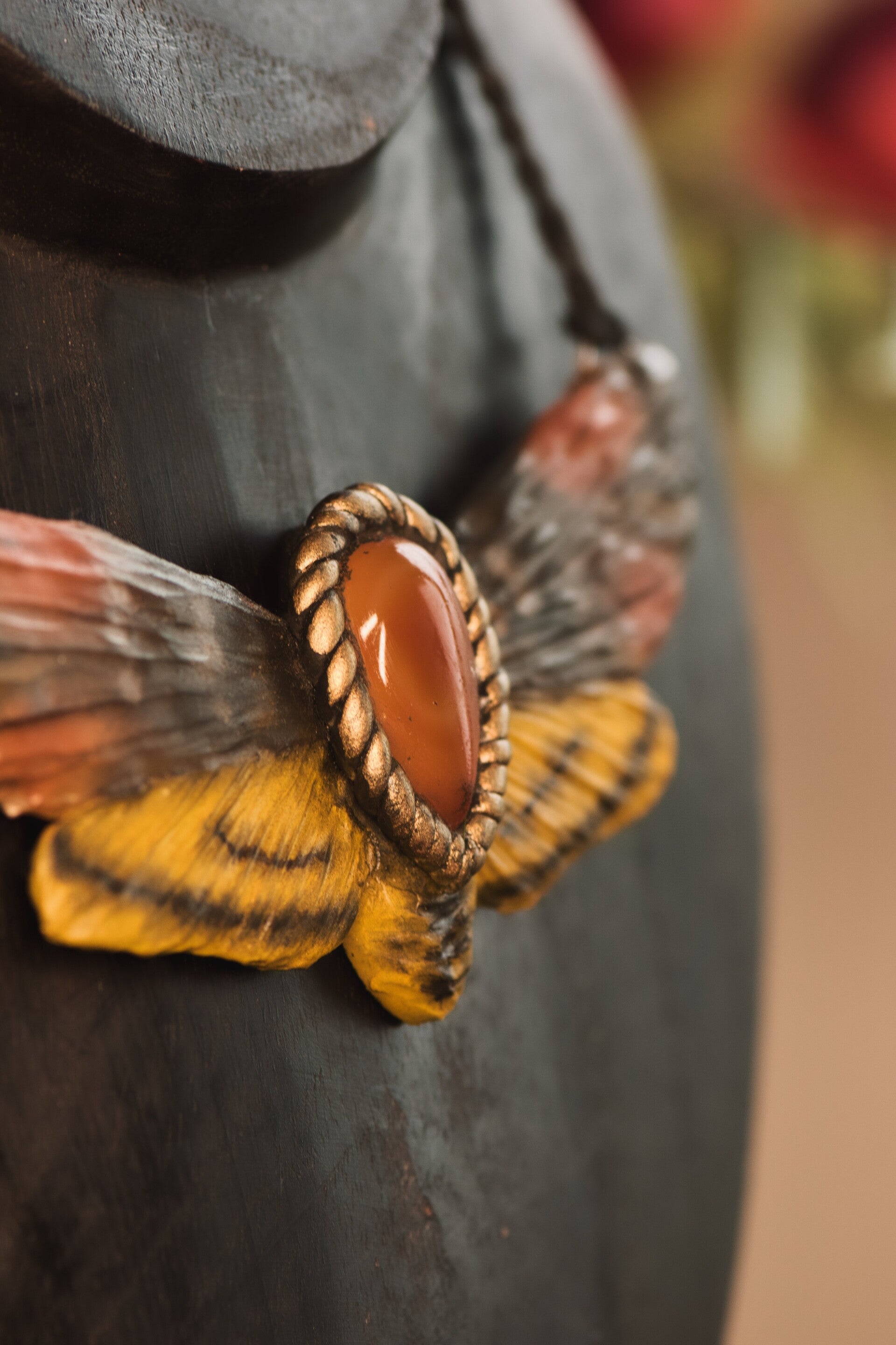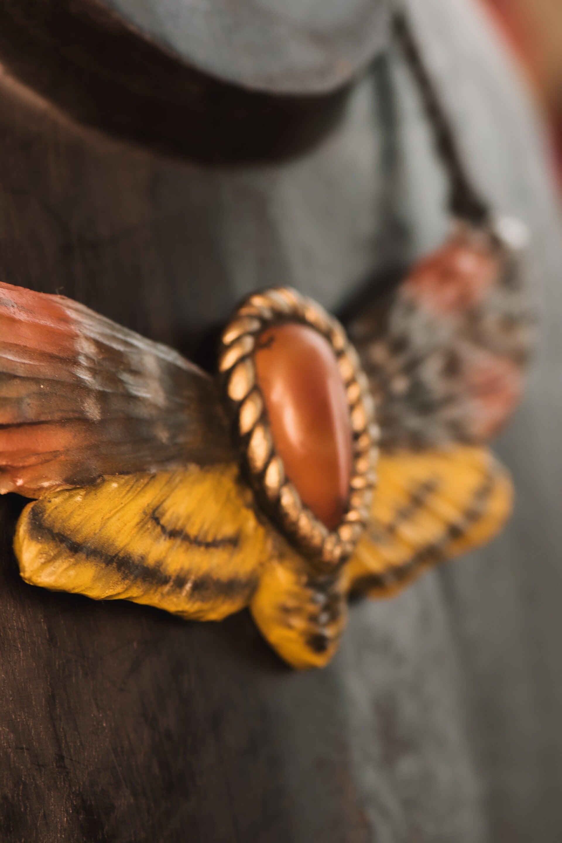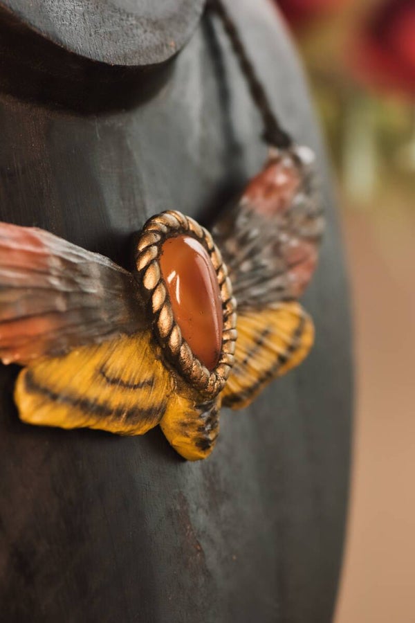 This one of a kind statement piece features a carnelian cabochon and handsculpted details.