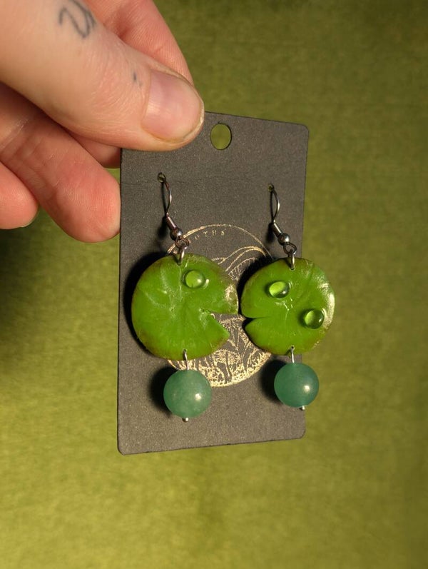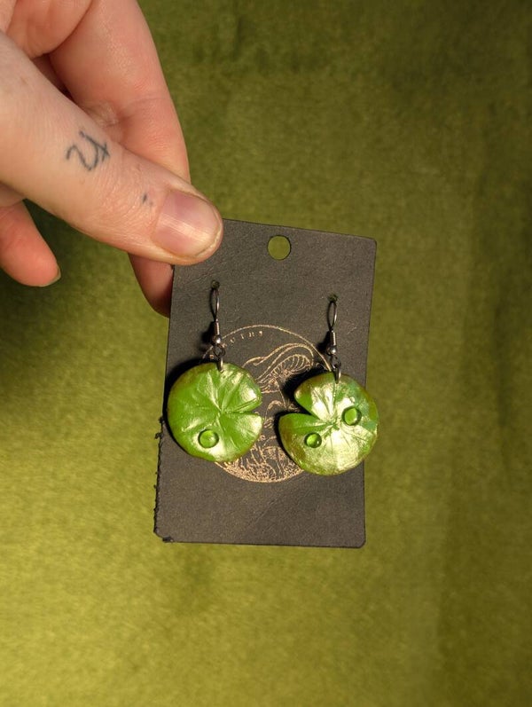 These cute Lily pad earrings look like they're straight out of the pond. Handsculpted, finished with a glossy coat and a little waterdroplet, these are the perfect whimsical addition to a fairy or goblincore look, or that awesome gift for a swampwitch.