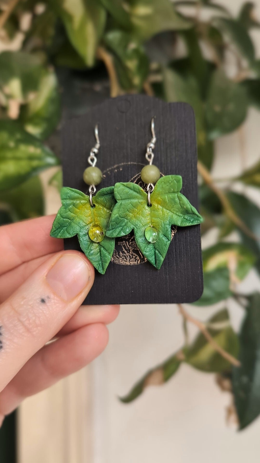 Simple Ivy earrings, handmade from polymer clay and coloured with pastels.