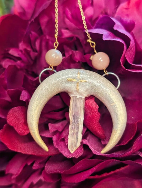 Moon necklace available in all kinds of variations. Whether you like something dark, natural or whimsical, these necklaces are customisable and made to fit with your outfit!