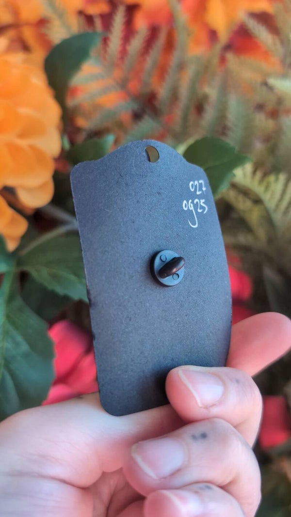 This single pin is made to look like a tiny round door. A whimsical addition to any renfaire or fantasy look, or to enchant your bag with.