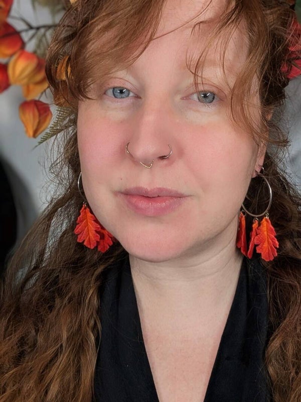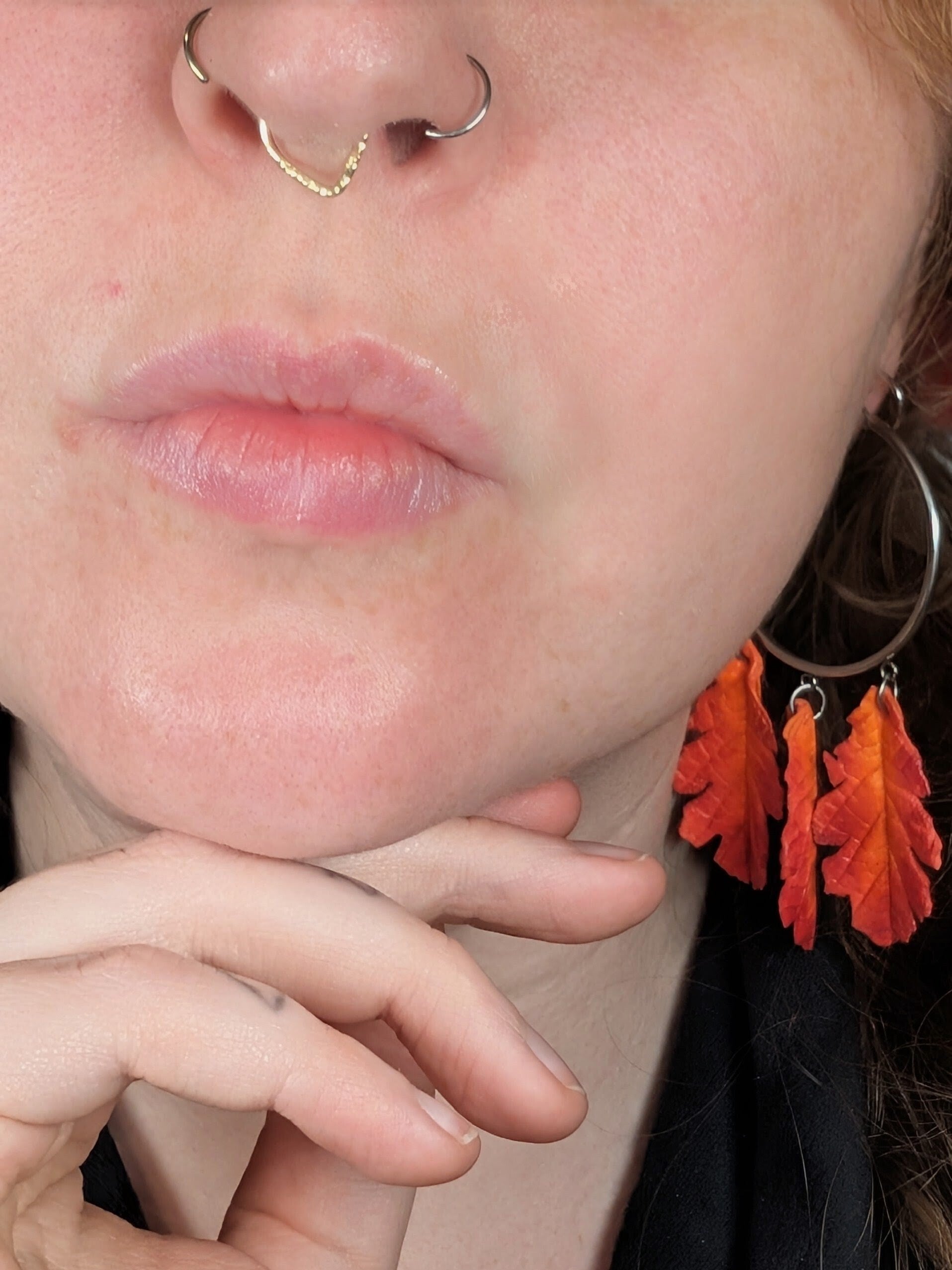 Stainless steel, lightweight hoops with hand sculpted oak leaves in orange/burgundy colouring. Comfortable and lightweight, perfect for a fall look.