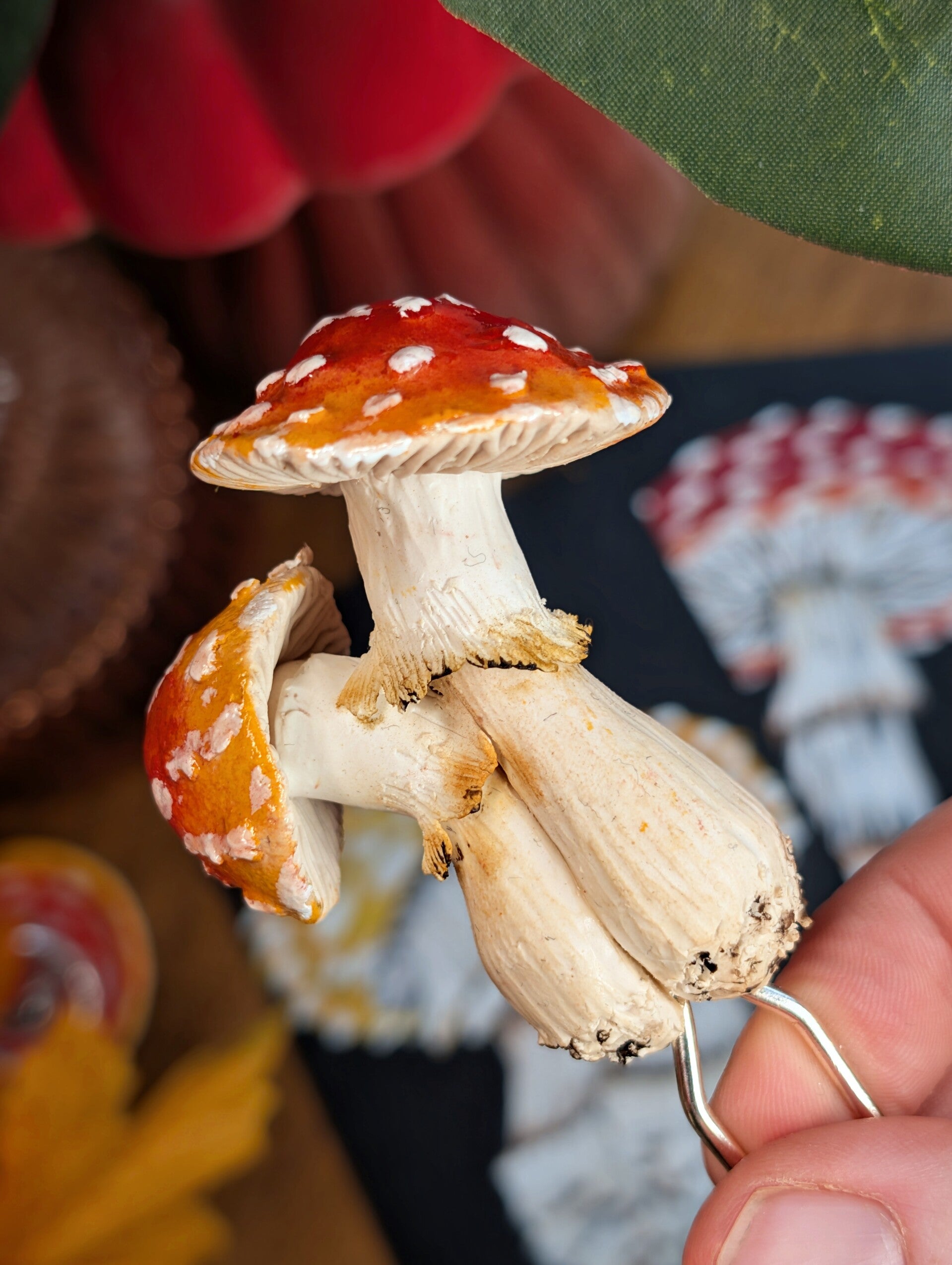 Unique, double forked mushroom hairpins for a whimsical look. Each one is hand sculpted, painted and varnished for extra durability.