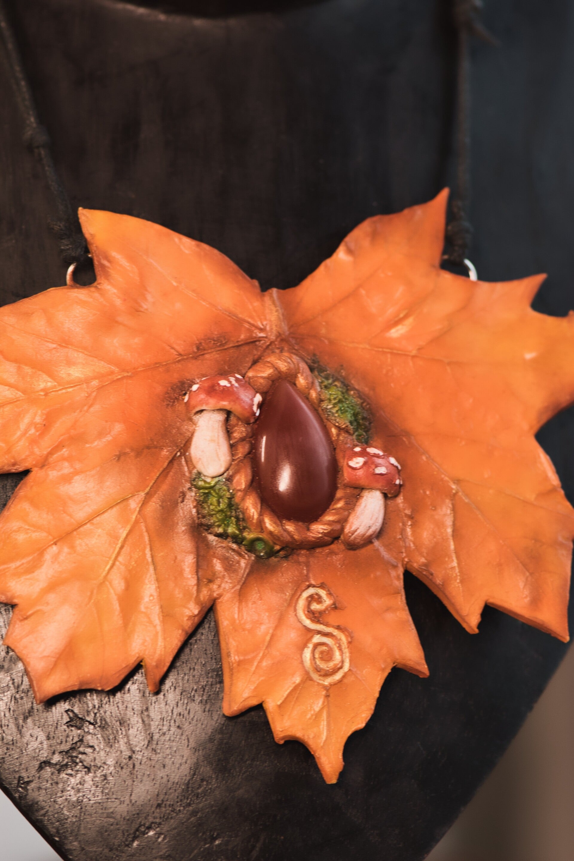 A beautiful handsculpted leaf necklace with carnelian cabochon and mushroom details.