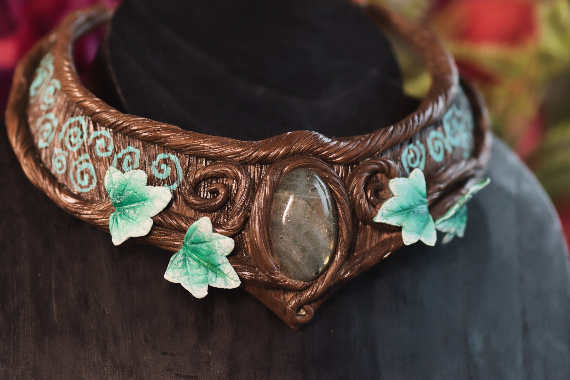 A beautiful handsculpted choker with labradorite cabochon, branch and leaf details and hand painted swirls.