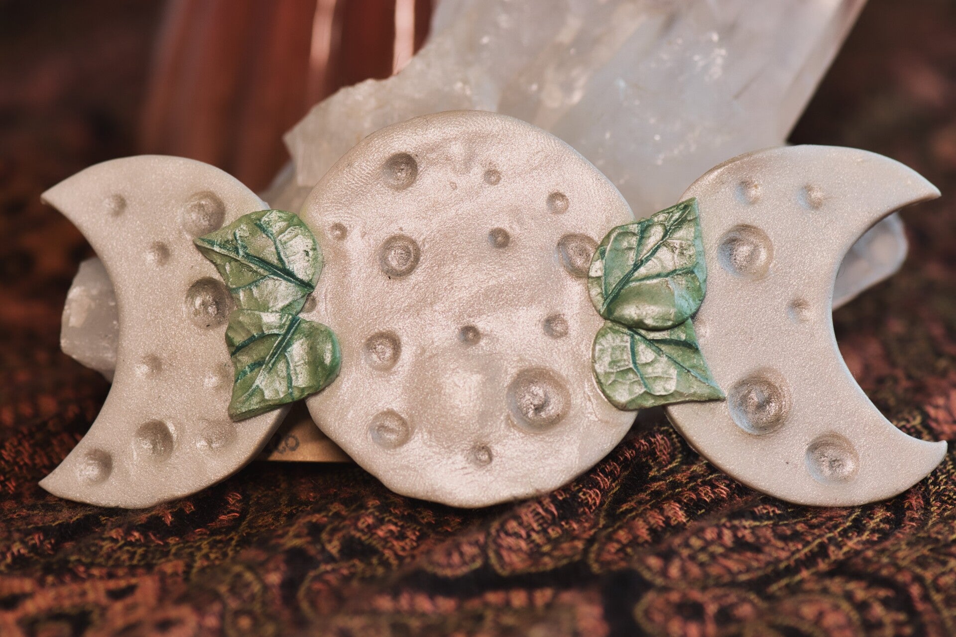 Stunning larger hairclip with moon phases made from pearlescent effect clay with pastel leaves.