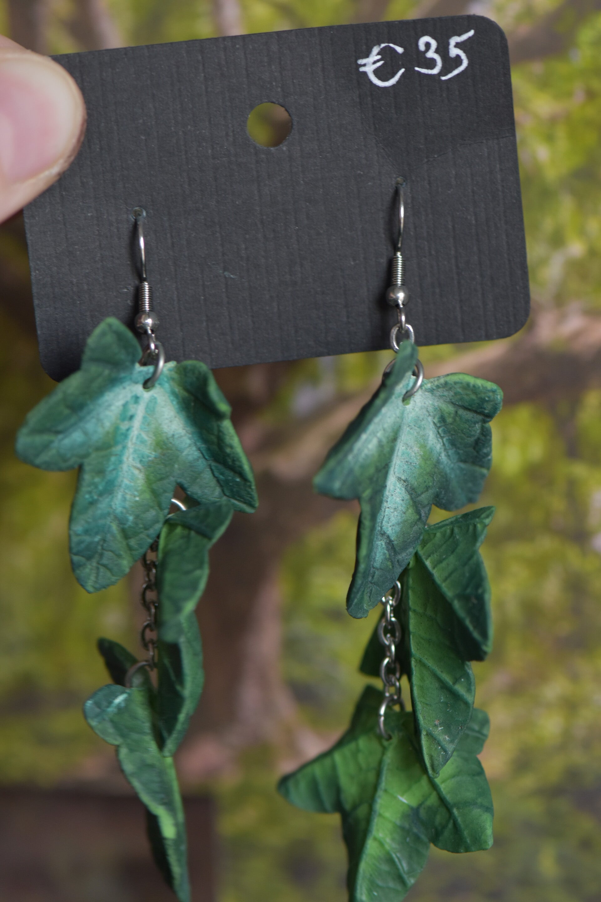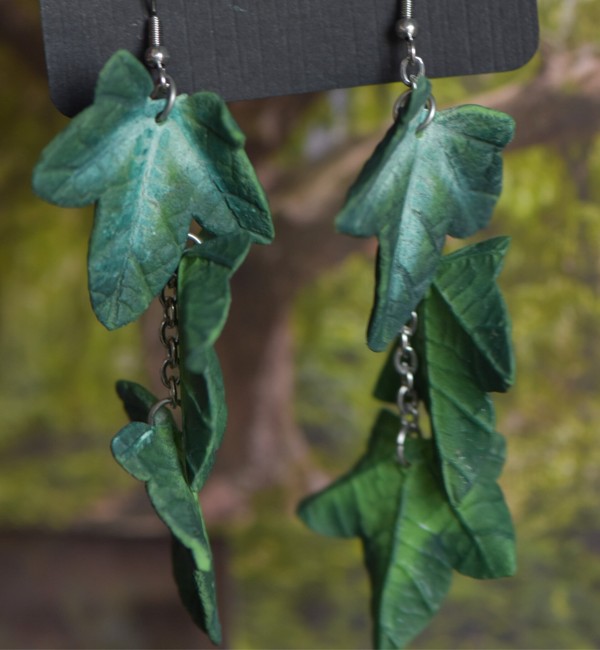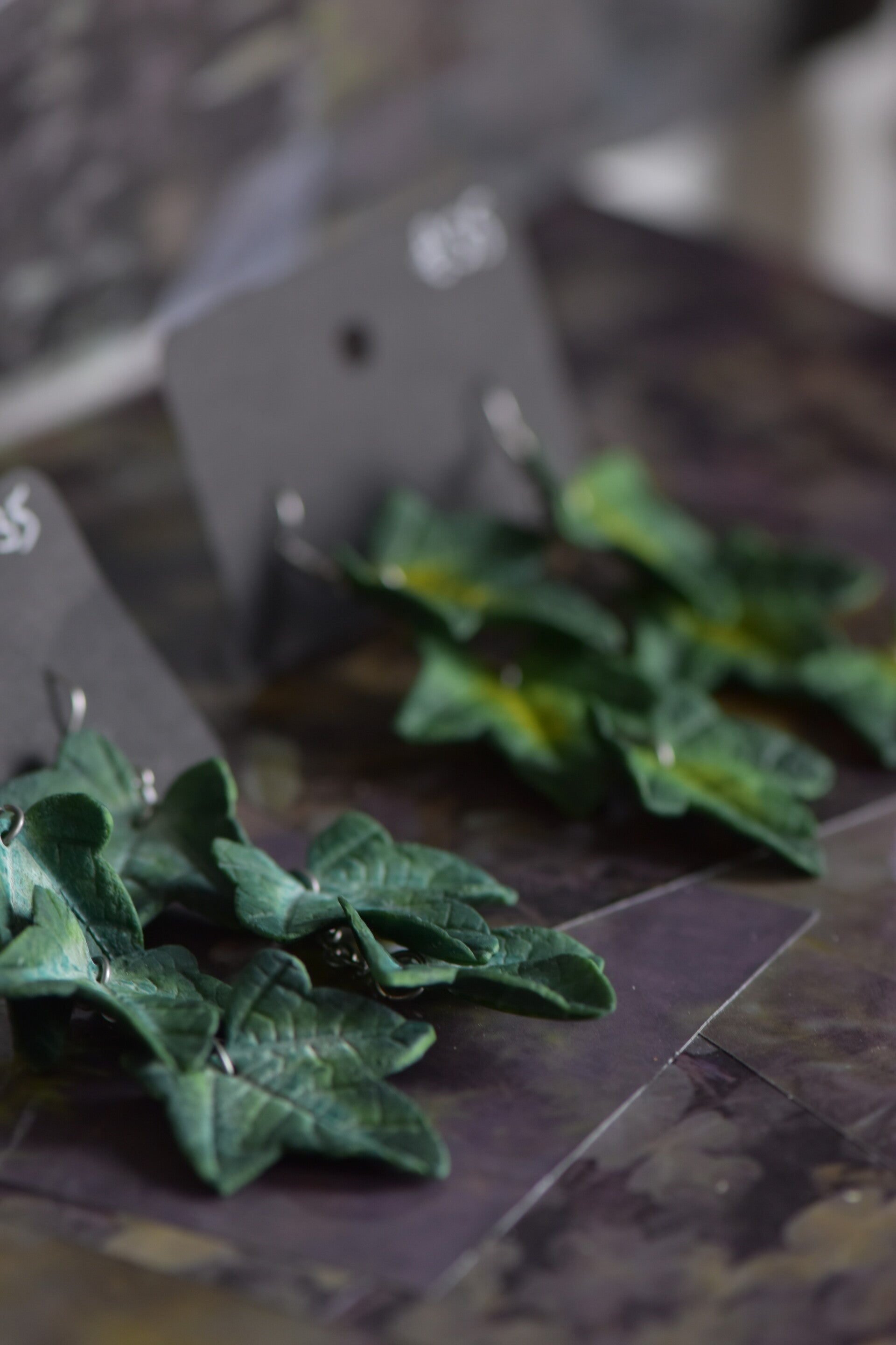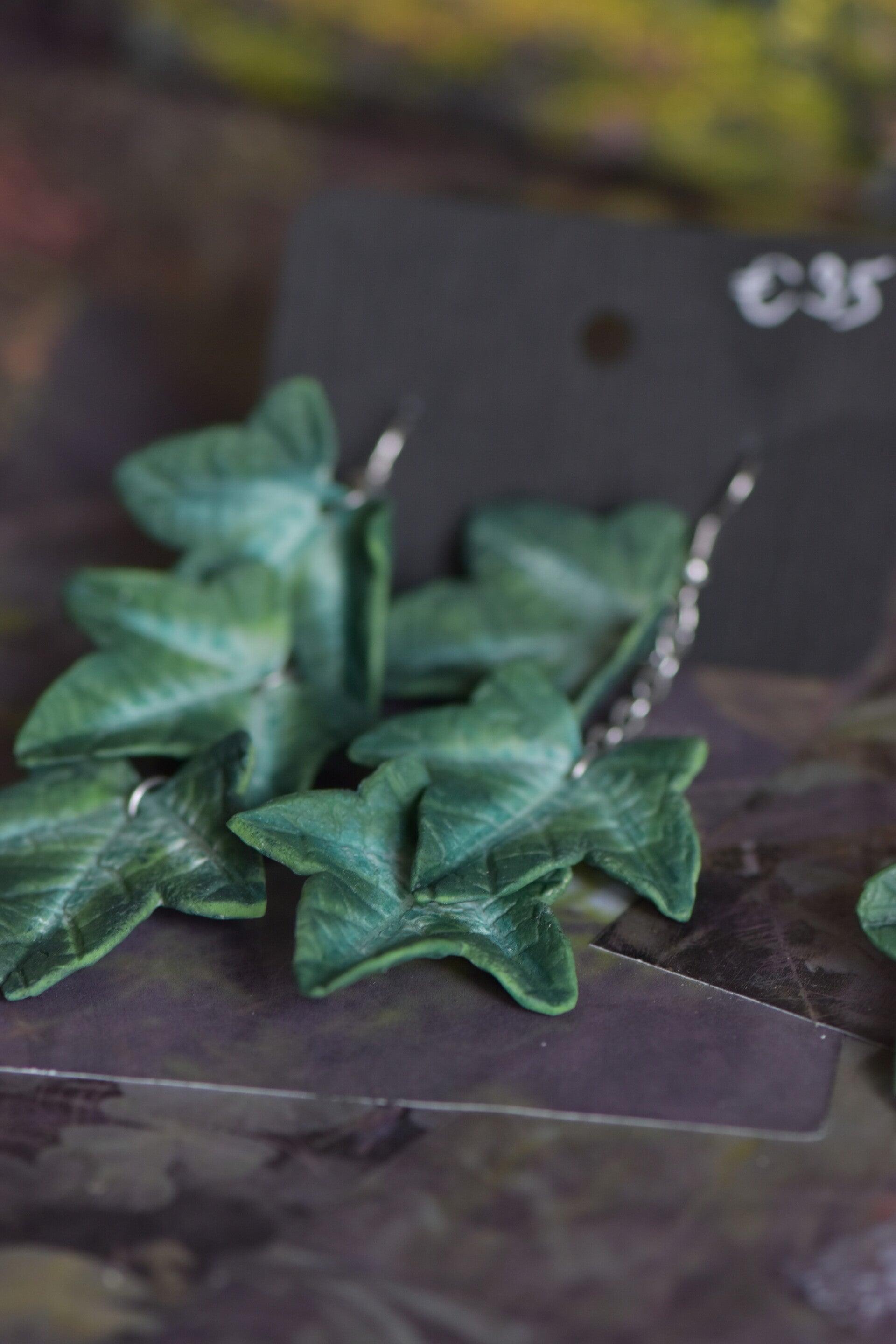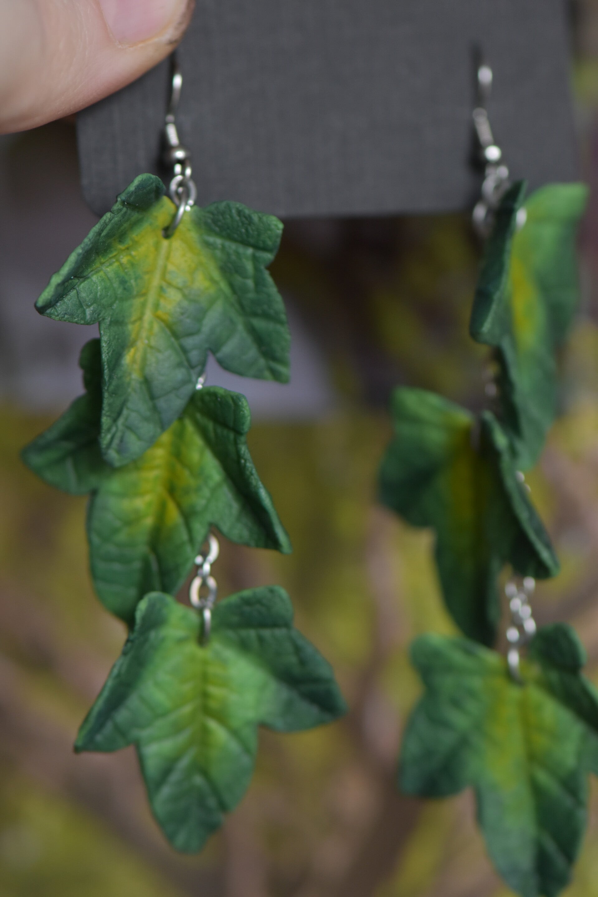 Beautiful pair of ivy dangle earrings with three hand-sculpted ivy leaves per earring. Available in two colour variations. Optional moss agate beads available.