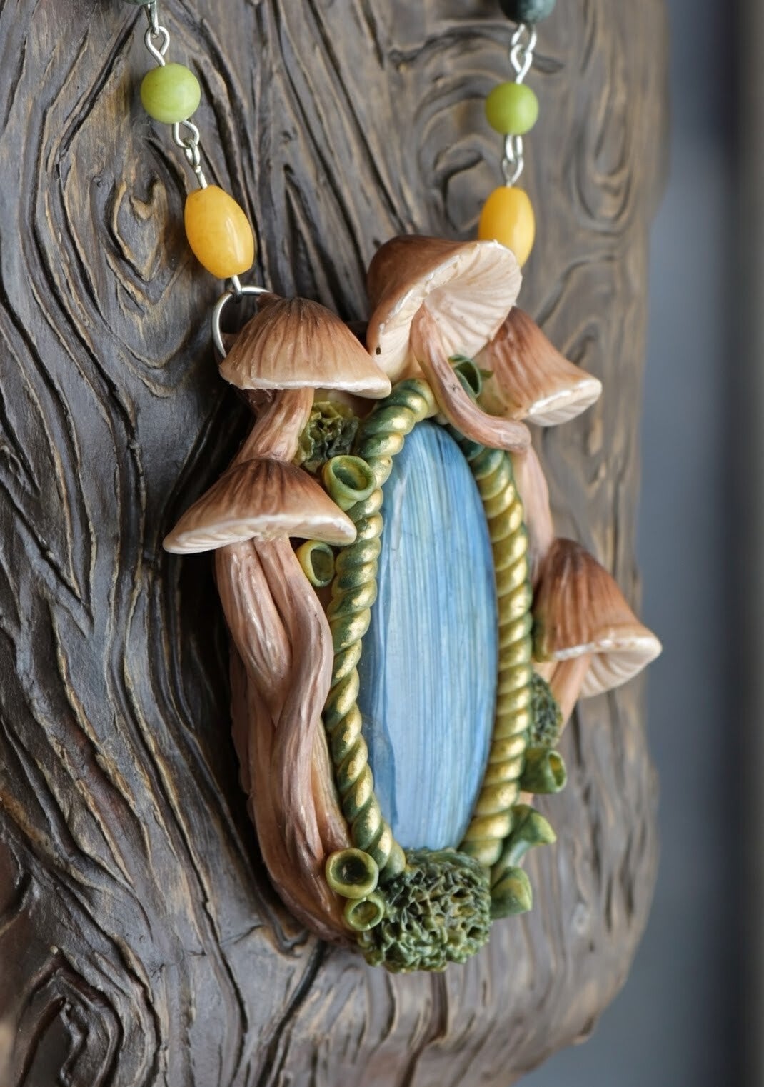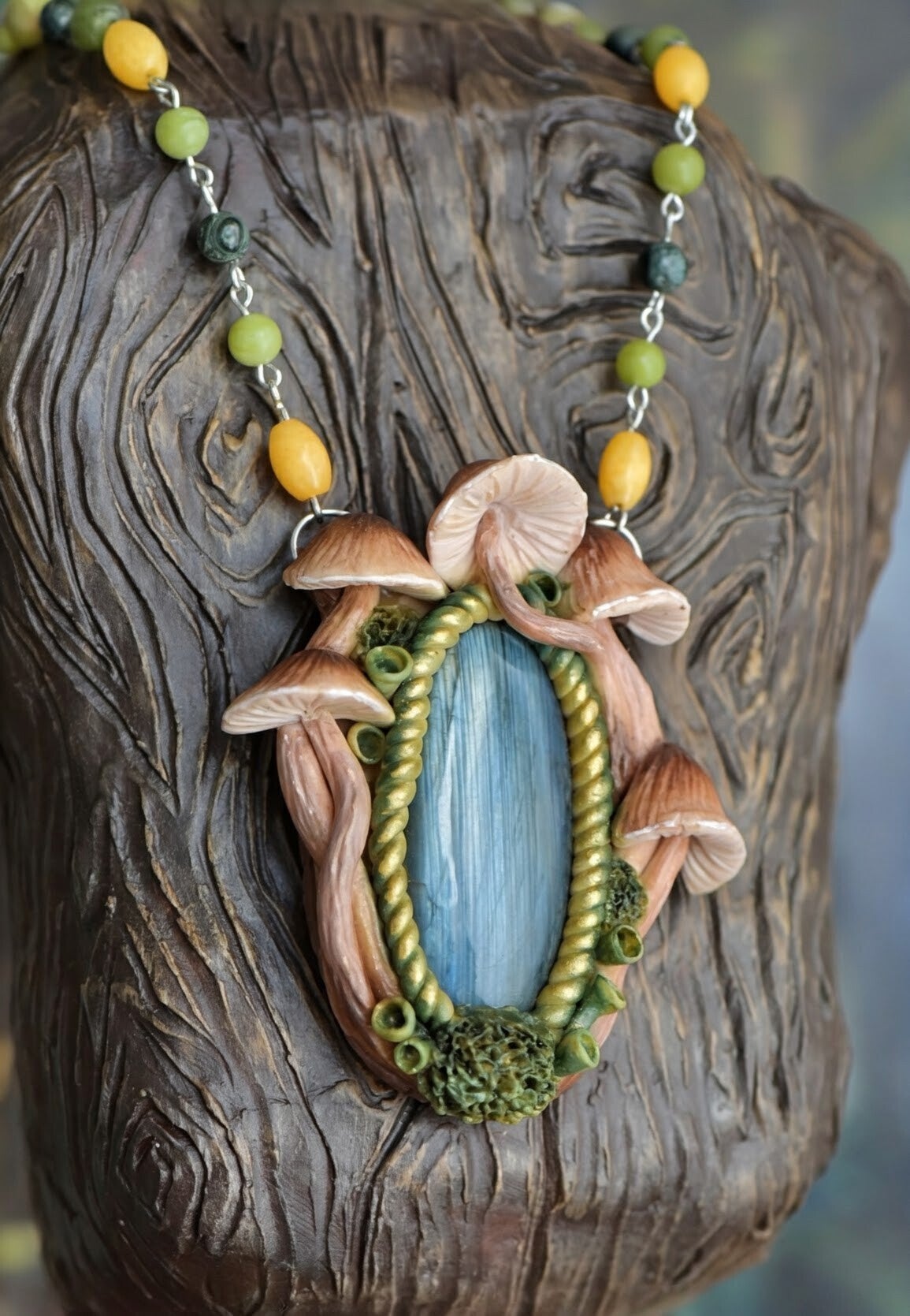 Handmade polymer clay necklace with genuine Labradorite cabochon. Lovely mushroom details, sculpted moss and lichen and a metallic golden frame around the labradorite. Finished with a beaded chain with gemstone beads.