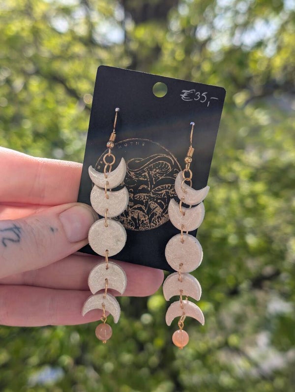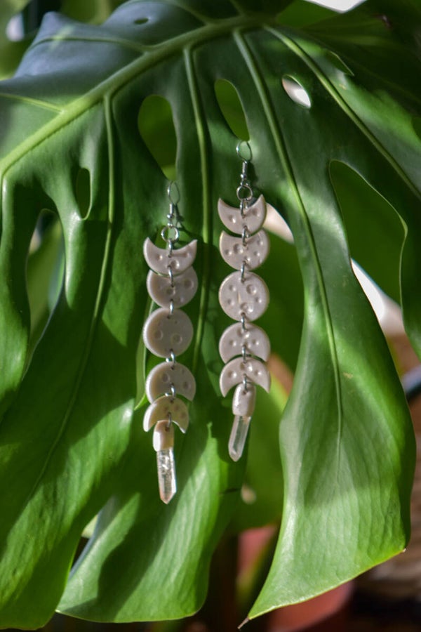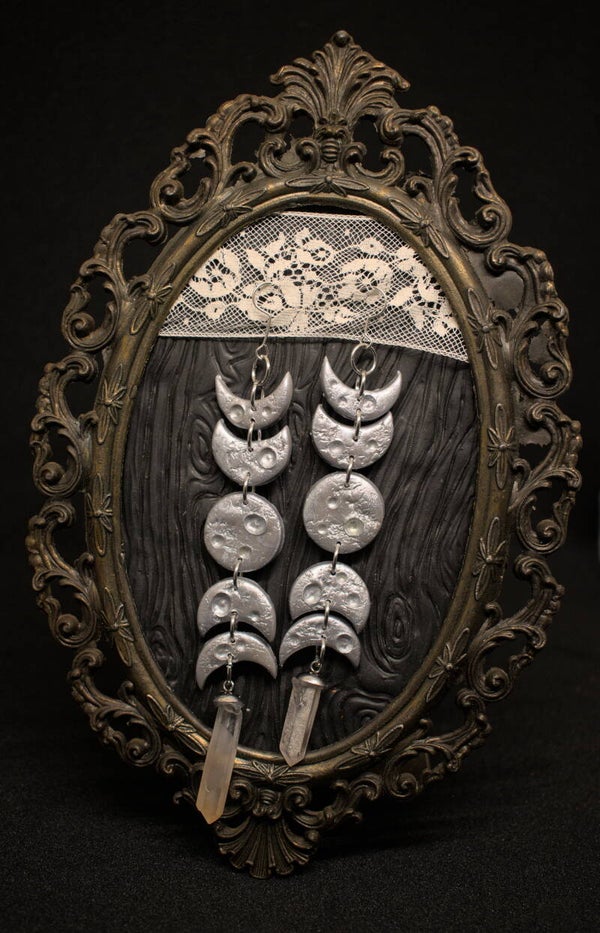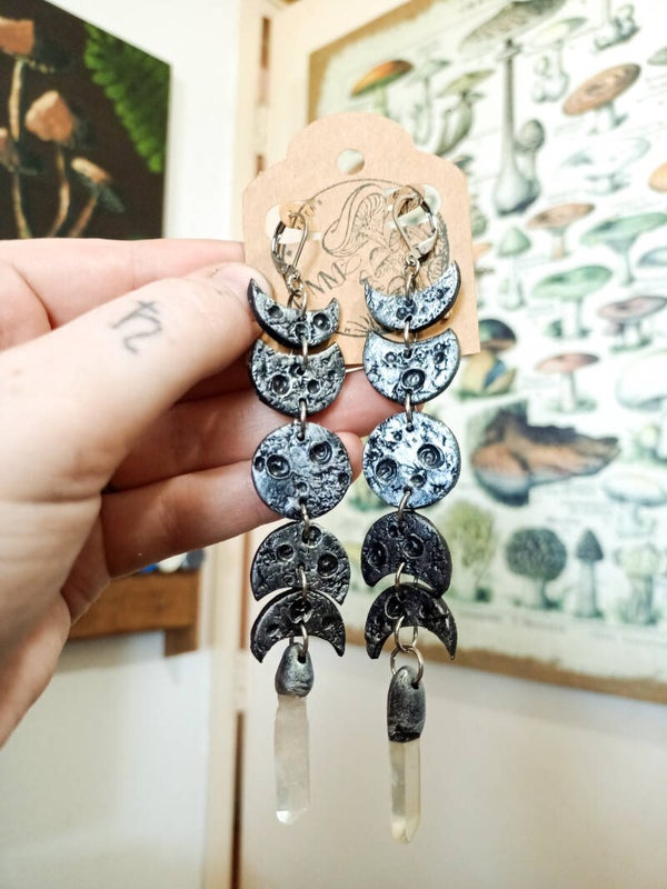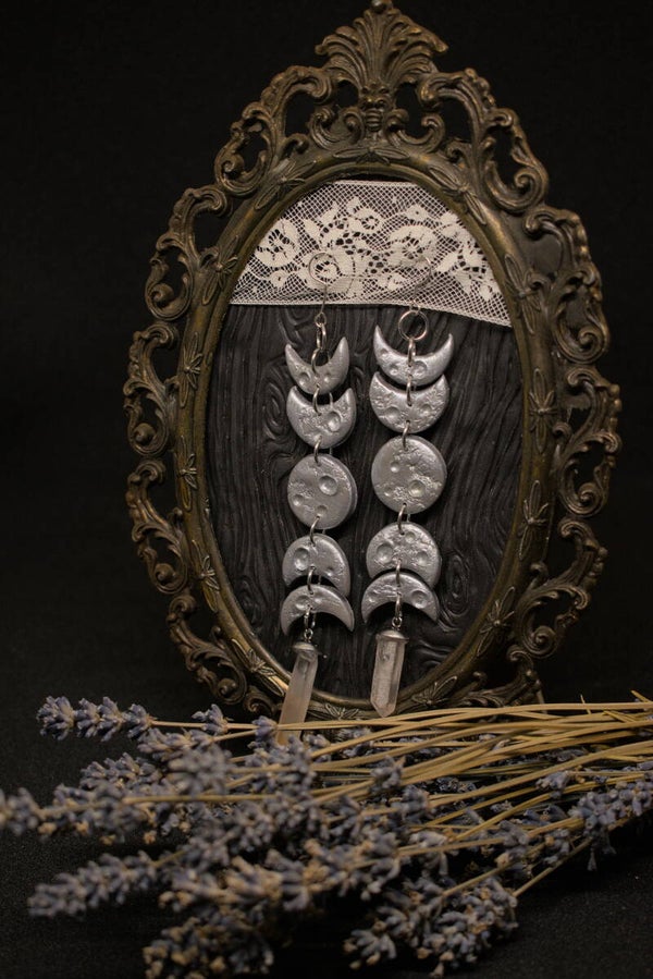 The Moon has been important imagery for witches and the occult for a long time. This inspired me to combine your "standard" moon earrings with a more realistic texture and a silvery paint job. I also added little quartz crystals at the bottom for an extra magical look.